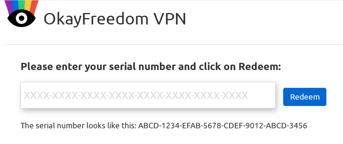 Установите OkayFreedom VPN на компьютер, в меню программы выберете - Управление лицензией ...> Введите серийный номер